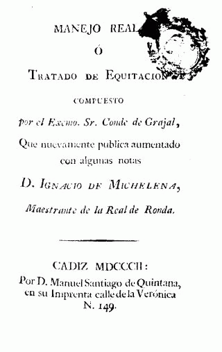 Manejo Real [Texto impreso] : ó Tratado de equitacion / compuesto por el conde de Grajal, que nuevamente publica aumentado con algunas notas Ignacio de Michelena