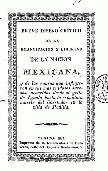 Breve diseño crítico de la emancipacion y libertad de la Nacion Mexicana, y de las causas que influyeron en sus mas ruidosos sucesos, acaecidos desde el grito de Iguala hasta la espantosa muerte del libertador en la villa de Padilla [Texto impreso] [por el Editor mexicano]