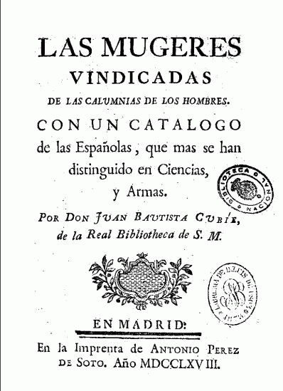 Las mugeres vindicadas de las calumnias de los hombres [Texto impreso] : con un catalogo de las Españolas, que mas se han distinguido en Ciencias y Armas / por Don Juan Bautista Cubíe, ...