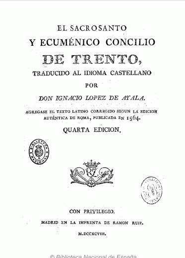 El sacrosanto y ecuménico Concilio de Trento traducido al idioma castellano por Don Ignacio Lopez de Ayala ; agregase el texto latino corregido segun la edicion auténtica de Roma, publicada en 1564