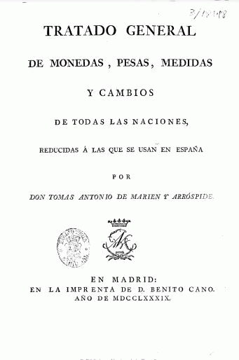 Tratado general de monedas, pesas, medidas y cambios de todas las naciones reducidas á las que se usan en España / por Don Tomas Antonio Marien y Arrospide