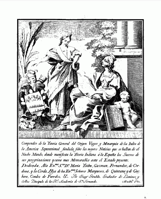 Compendio de la Ystoria general del origen viajes y monarquia de los indios de la America septentrional fundada sobre las mejores noticias que se hallan de el Nuebo [sic] Mundo ... [Texto impreso] / por Josef Giraldo, grabador de laminas y sellos ...