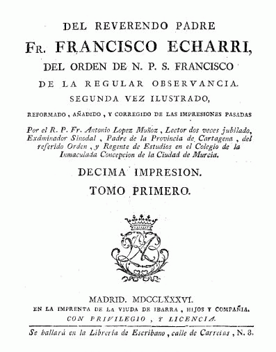 Directorio Moral del Reverendo padre Fr. Francisco Echarri del Orden de N. P. S. Francisco de la Regular Observancia [Texto impreso] segunda vez ilustrado reformado, añadido y corregido de las impresiones pasadas por el R.P. Fr. Antonio Lopez Muñoz ... del referido Orden ... ; tomo primero [-segudo]