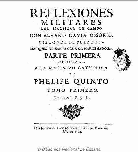 Reflexiones militares del Mariscal de Campo don Alvaro Navia Ossorio, vizconde de Puerto, ò marques de Santa Cruz de Marzenado &c ... dedicada a la magestad catholica de Phelipe Quinto ... : Tomo primero [-Tomo II] by