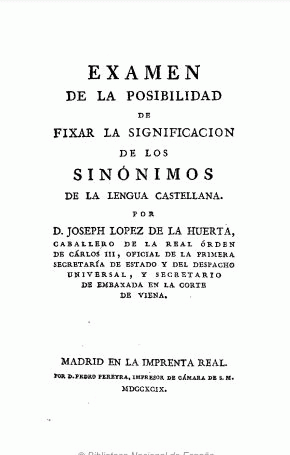 Examen de la posibilidad de fixar la significacion de los sinónimos de la lengua castellana [Texto impreso] / por Joseph Lopez de la Huerta ... by